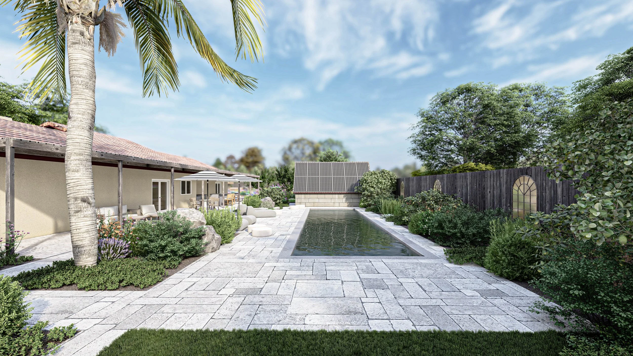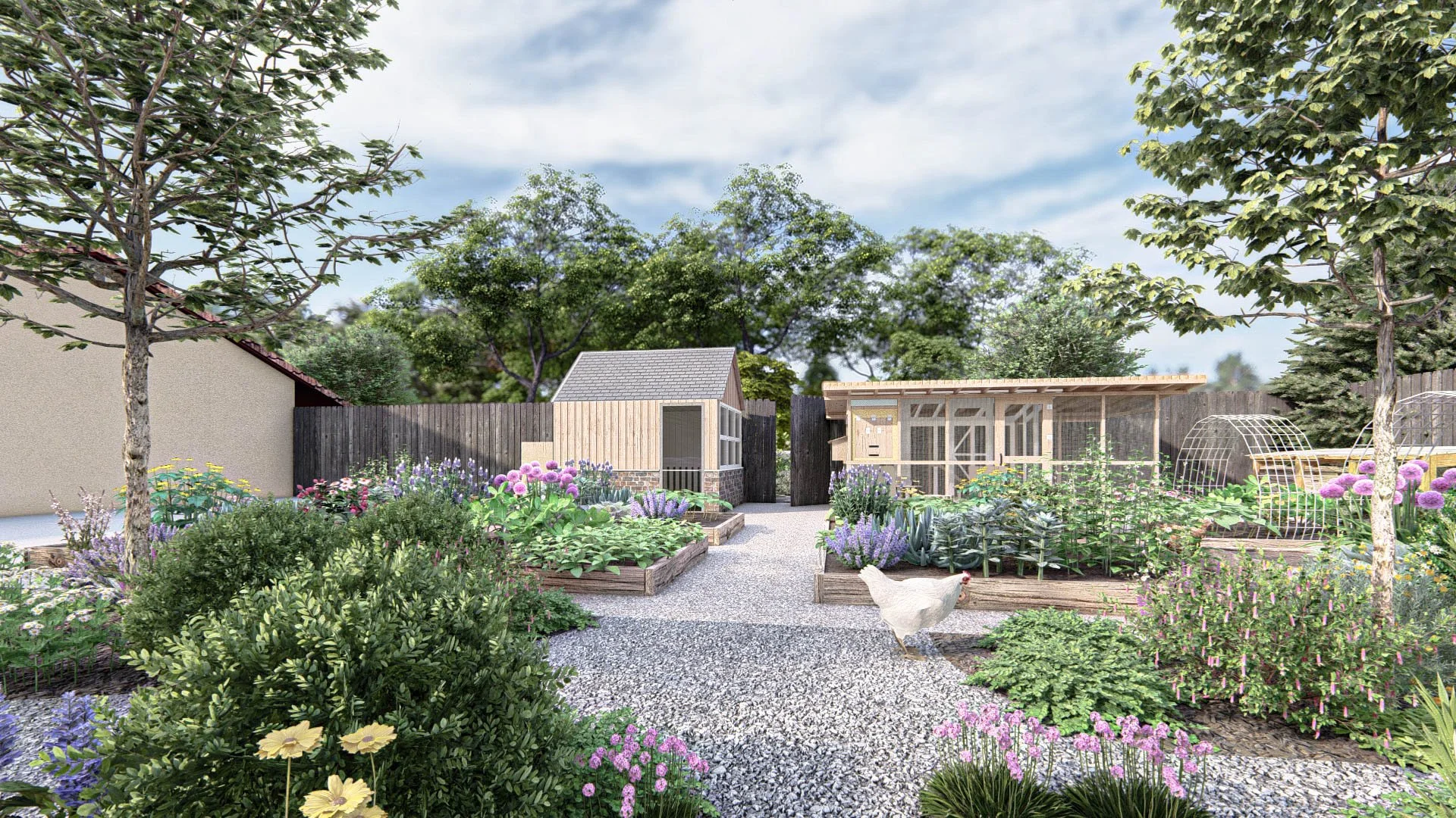 A longterm vision for the property masterplan incorporating these key elements to create a harmonious and functional design: A tranquil meditation space, providing a serene environment for relaxation. A labyrinth with dedicated areas for growing Ayurvedic medicine plants and kitchen herbs. Functional spaces for chickens, a shed, and open space for wine equipment. An engaging kid friendly design, inviting and safe for running and exploration. An expansive recreational area that integrates with the pool. A separate comfortable sitting area for the Airstream guests.