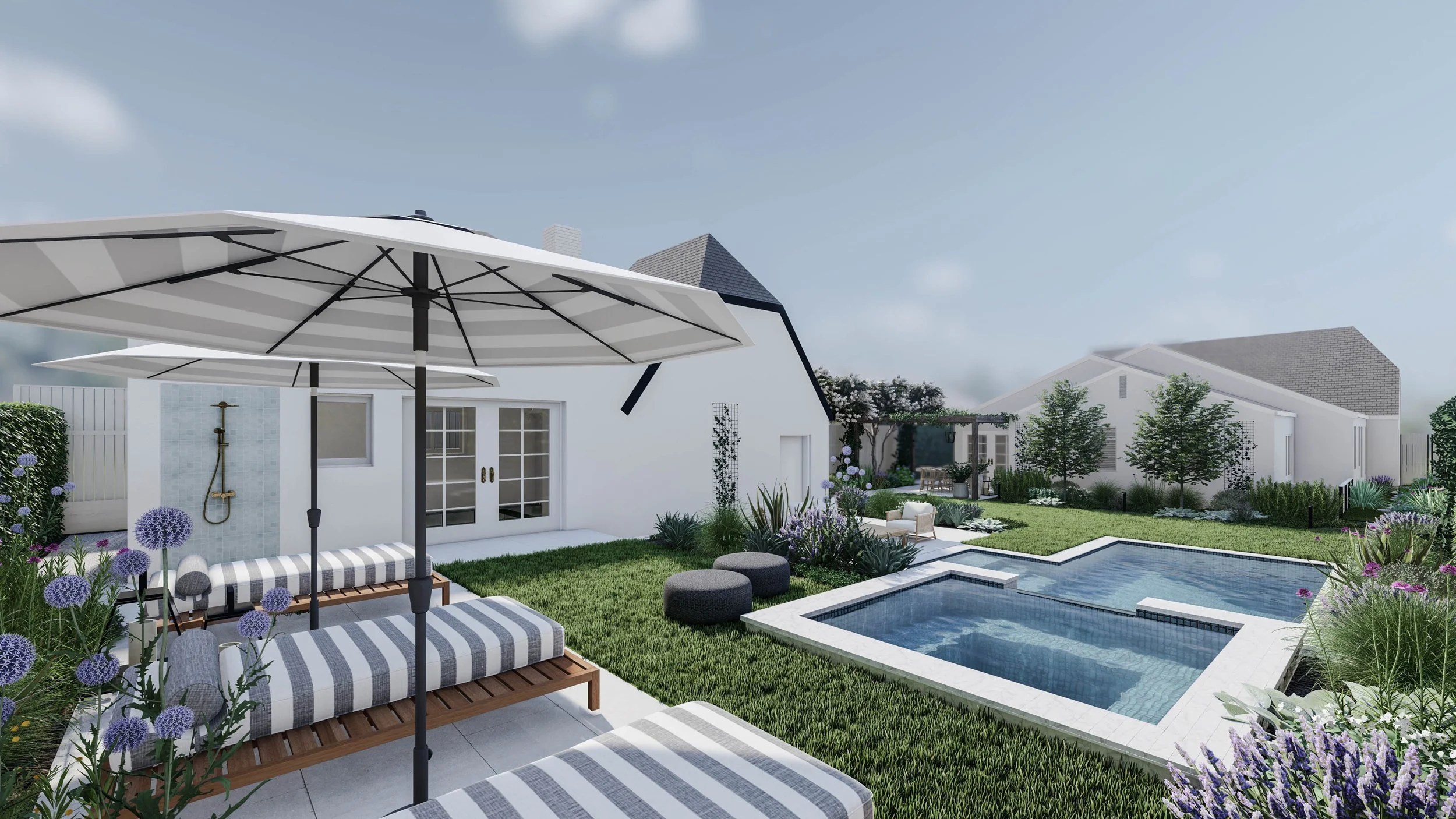 This beautiful historic Tudor home, built in 1926, wanted to enhance its curb appeal, maximize space to increase resale value, and create a relaxing and safe family environment. The front yard features an English/French country cottage garden style with feathery grasses, nepeta, cistus, santolina, and teucrium with a color palette primarily of purples, greens, and white. The backyard design incorporates shade solutions to reduce the summer’s excessive heat. A long, rectangular pool on the elevated lawn area, extends into the patio to create a central relaxation and play area. The patio benefits from the afternoon shade provided by the new two story ADU, along with a lounge space featuring an outdoor shower at the back tier of the yard.